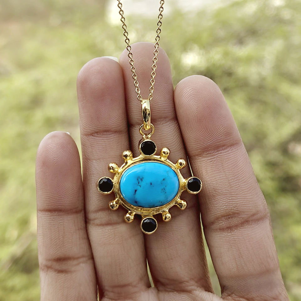 ผู้ค้าส่งจี้รูปไข่พลอยสีฟ้าเทอร์ควอยซ์ประดับด้วยควอตซ์สีดำ ชุบทอง 18k เครื่องประดับสไตล์โบโฮ สร้อยคอทองเหลือง