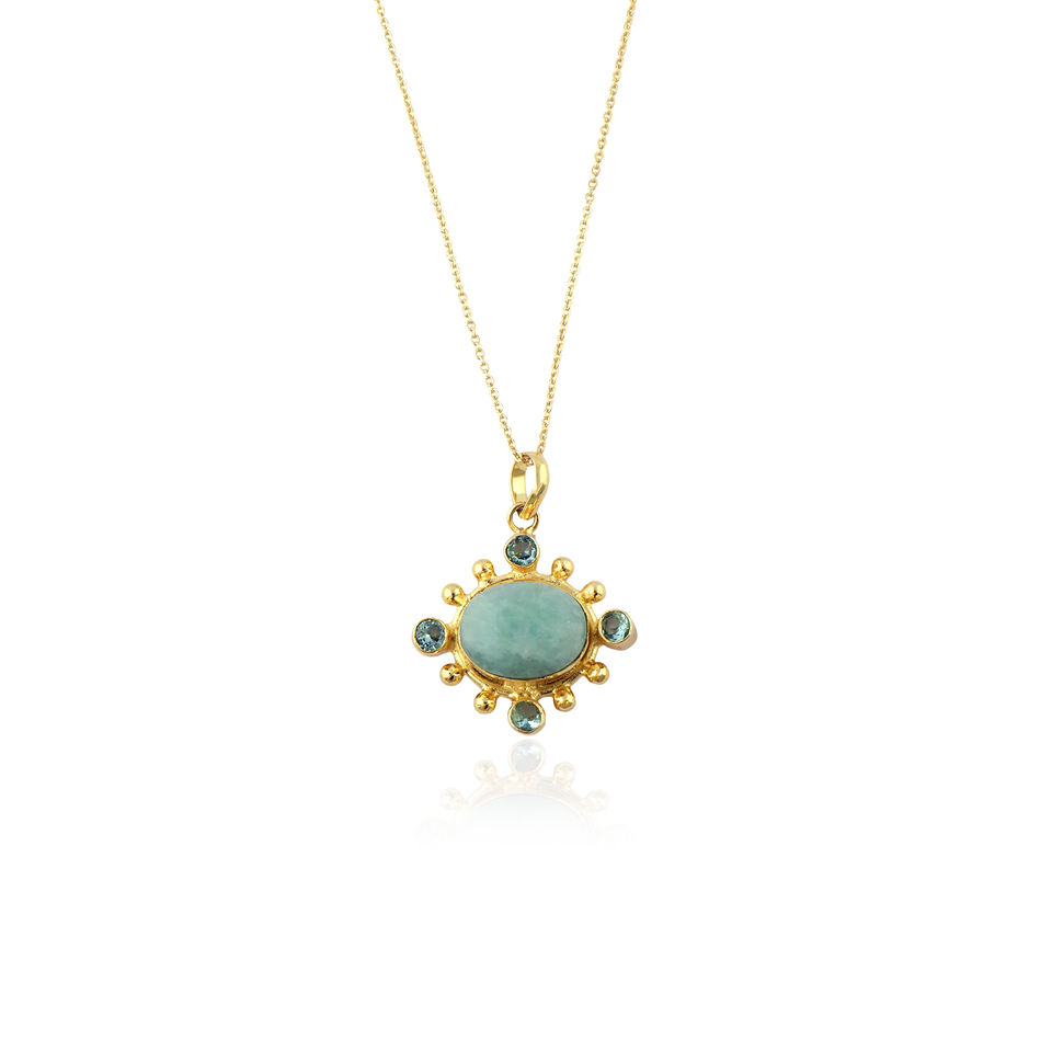 ผู้ค้าส่งอะเมโซไนต์ธรรมชาติพร้อมจี้รูปไข่ควอตซ์สีฟ้า ดีไซน์ลูกปัด สร้อยคอพร้อมสายทองเหลืองชุบทอง 18k