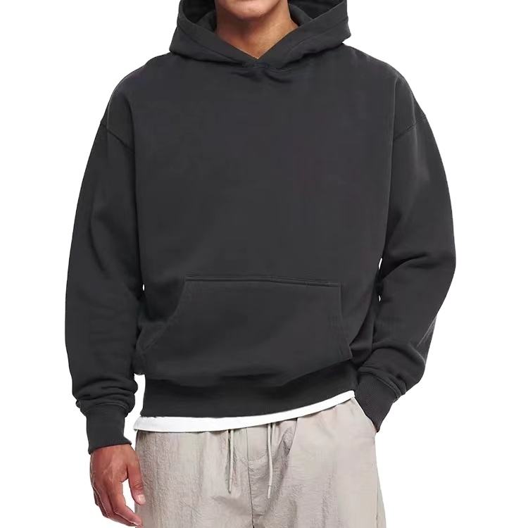 เสื้อฮู้ดแบบสวมหัวมีฮู้ดผ้าคอตตอนไร้เชือกเสื้อฮู้ดเย็บสีดำล้วนแบบปรับแต่งได้