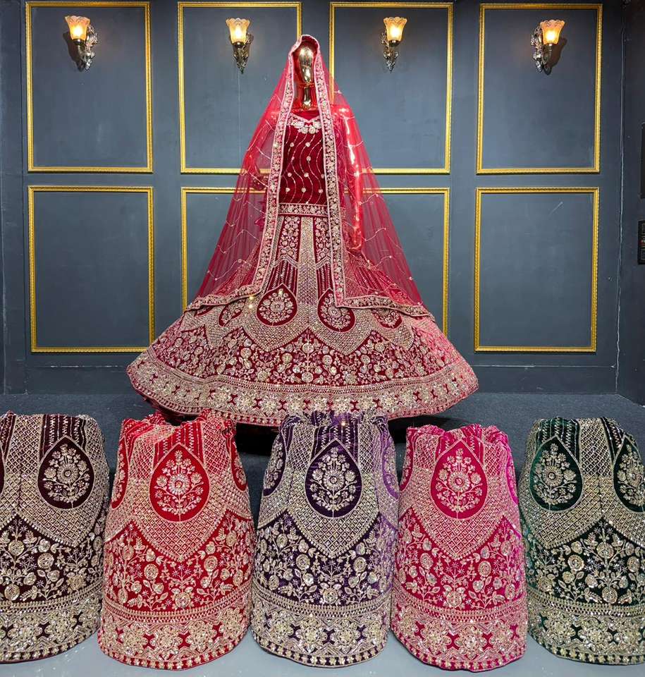 ชุดเลเฮนกาผ้ากำมะหยี่เนื้อหนาสำหรับเจ้าสาว งานปักใหม่ทั้งตัว ทรงบานใหญ่ มี 6 สี สำหรับงานปาร์ตี้ งานเฉลิมฉลอง และงานพิธีต่างๆ ขายส่ง