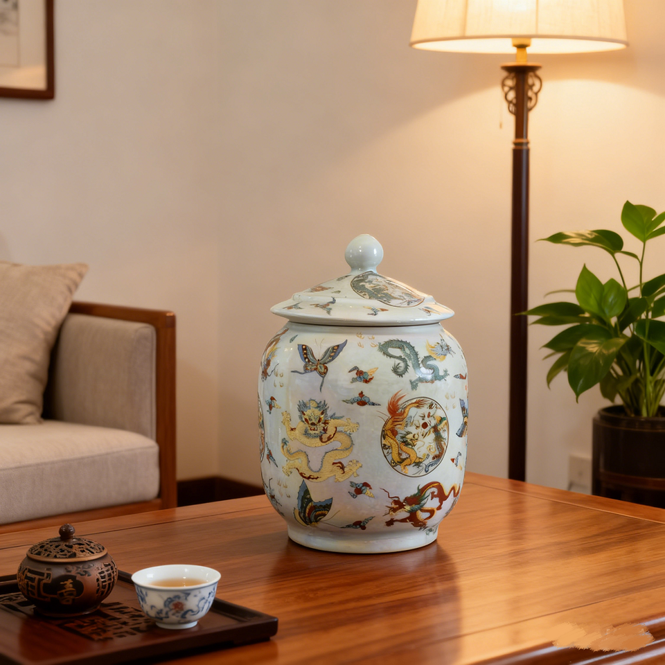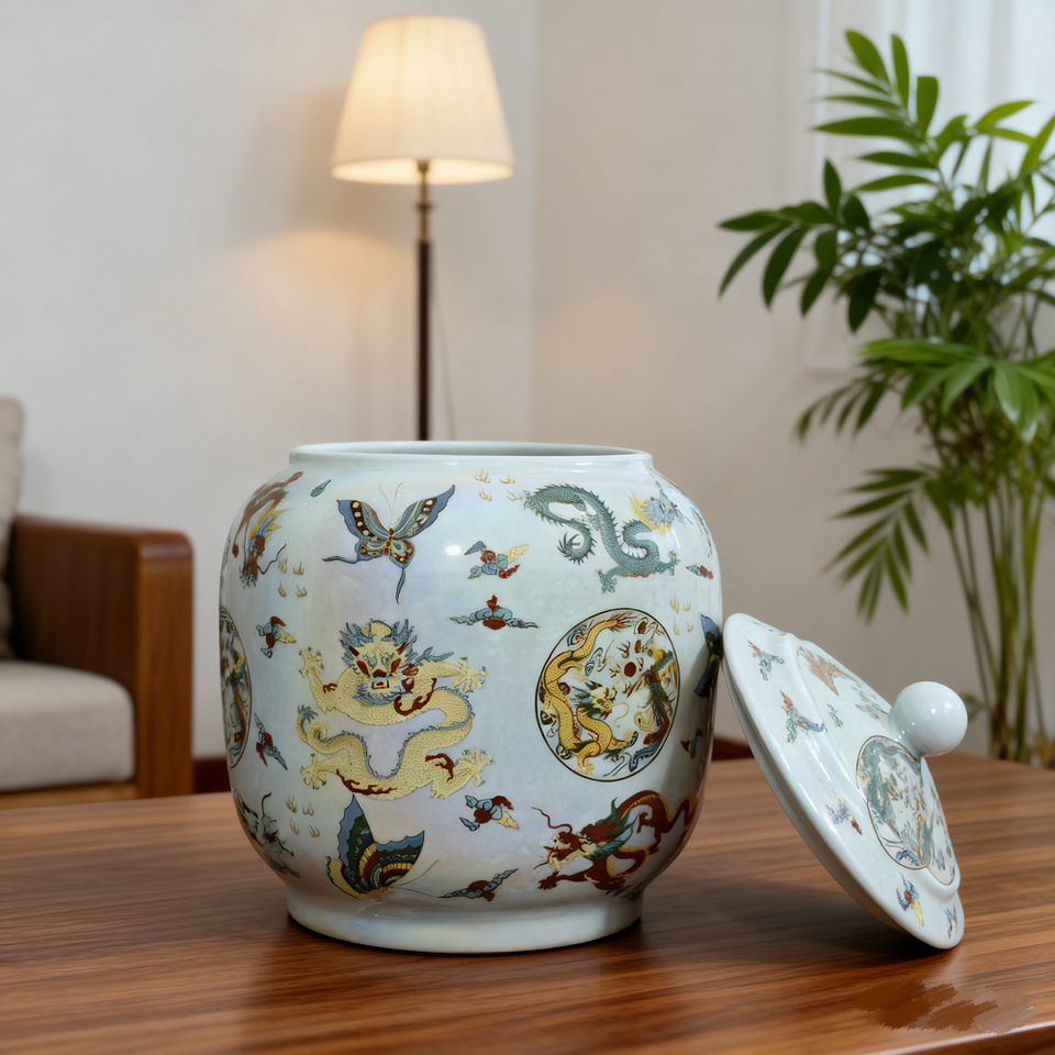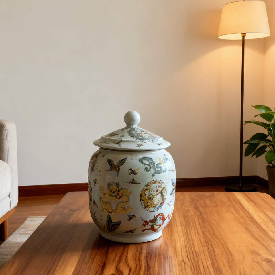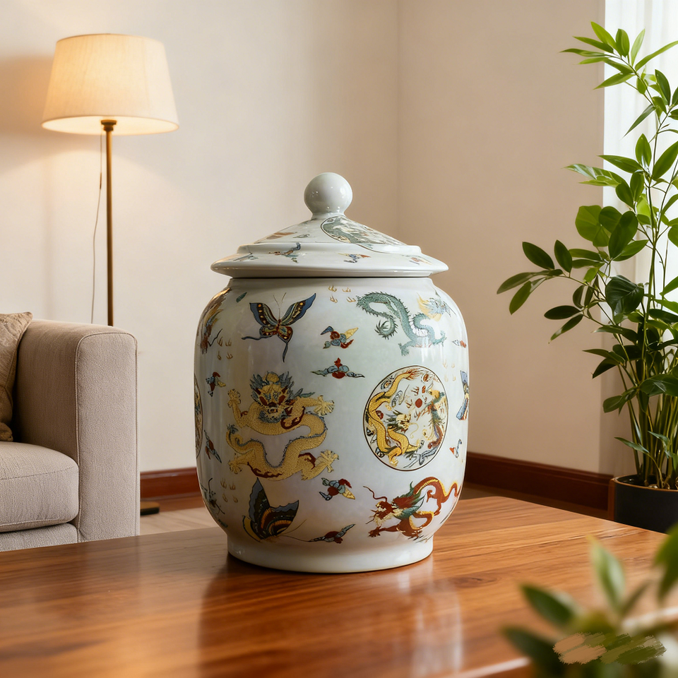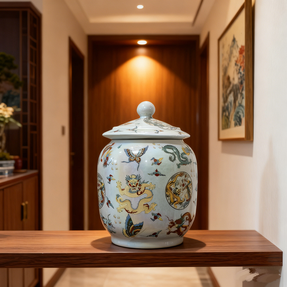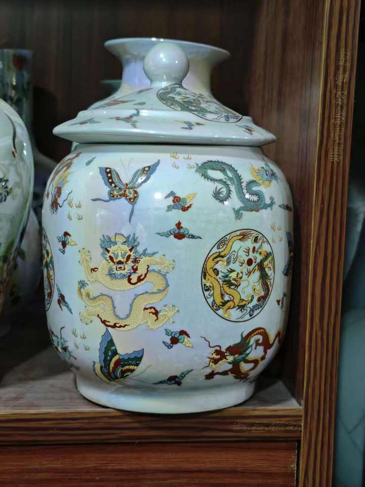 โถเก็บของเซรามิกจีนสีขาวขายส่ง ฝาปิดลายมังกร พร้อมแจกันเซรามิก