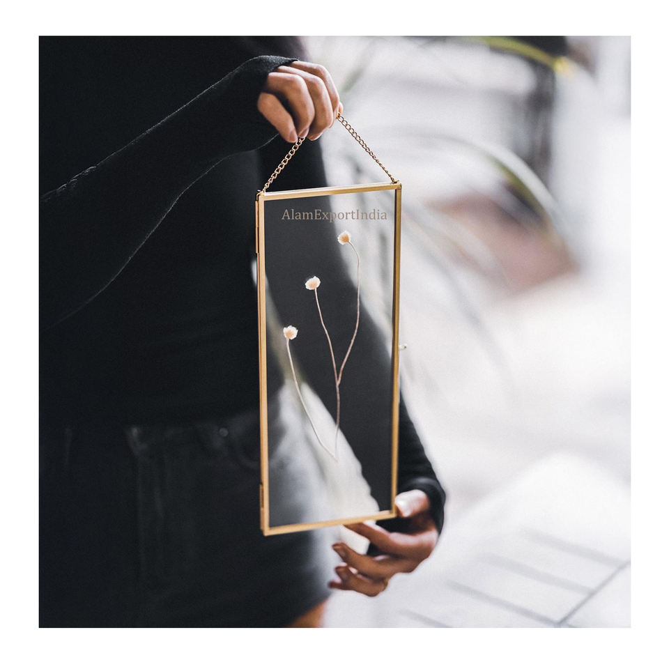 กรอบรูปติดผนังทรงสี่เหลี่ยมผืนผ้าทำมือจากแก้วใสสไตล์อินเดีย ตกแต่งขอบสีทอง สำหรับใส่ดอกไม้แห้งหรือรูปภาพ