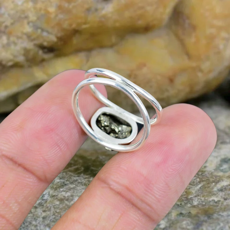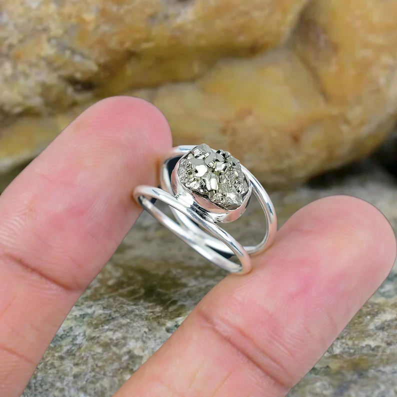 แหวนพลอยไพไรต์ดิบทำมือแหวนของขวัญทำมือเครื่องประดับแฟชั่น925สวย