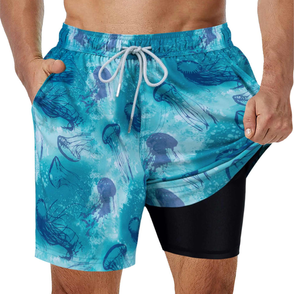 กางเกงว่ายน้ำสองชั้นสำหรับผู้ชายกางเกงขาสั้นแบบลำลองผ้าสแปนเด็กซ์โพลีเอสเตอร์พิมพ์ซับลิเมชัน