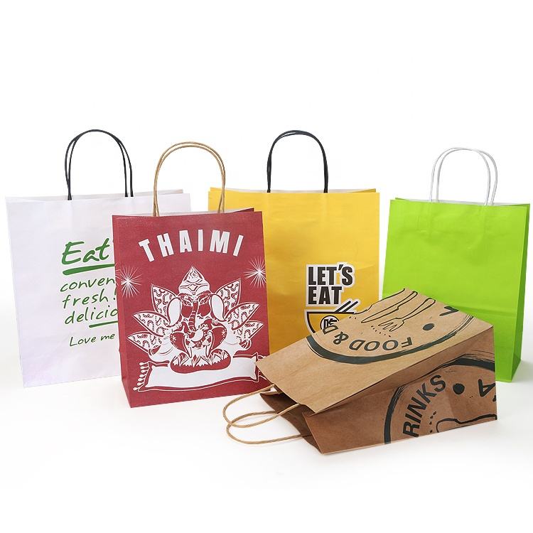 ถุงกระดาษคราฟท์สีน้ำตาลสำหรับใส่อาหารแบบนำกลับบ้าน พิมพ์โลโก้ตามสั่ง ราคาถูก รีไซเคิลได้ พร้อมหูหิ้วแบบเกลียว/แบบแบน ขายส่ง