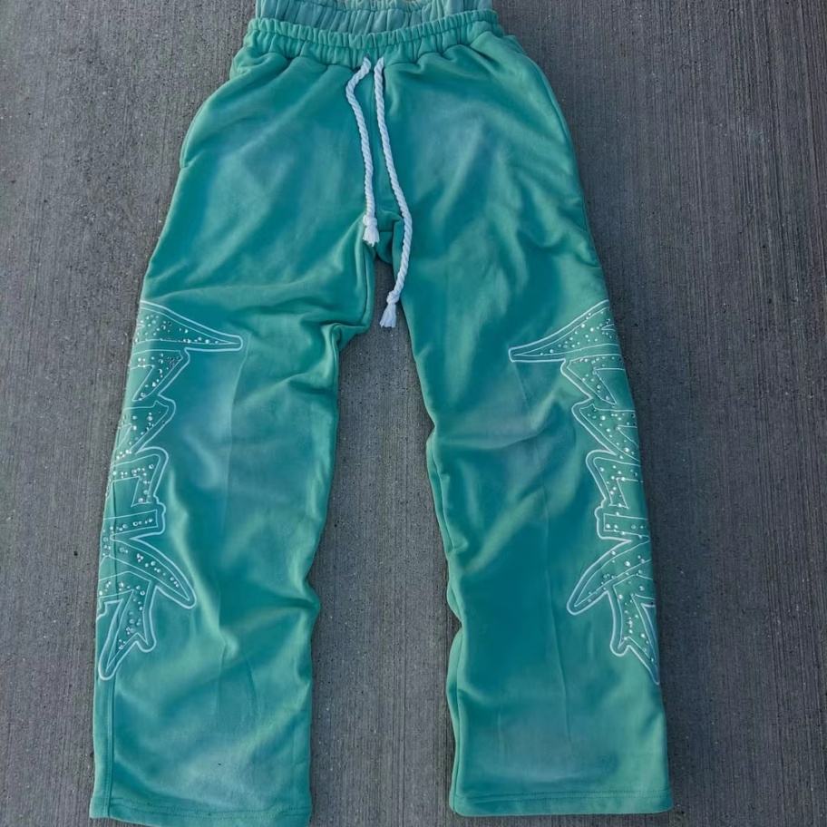 กางเกงขายาวผู้ชายทรงหลวมพิมพ์ลายสกรีนประดับเพชรเทียม สไตล์ซันเฟด เอวยางยืด ไซส์ใหญ่ รับผลิตตามสั่งขายส่ง