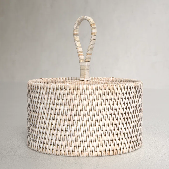 ชุดเก็บมีดหวายฟอกสีขาวแบบกลม4ส่วนอุปกรณ์จัดของในครัวงานสานมือ
