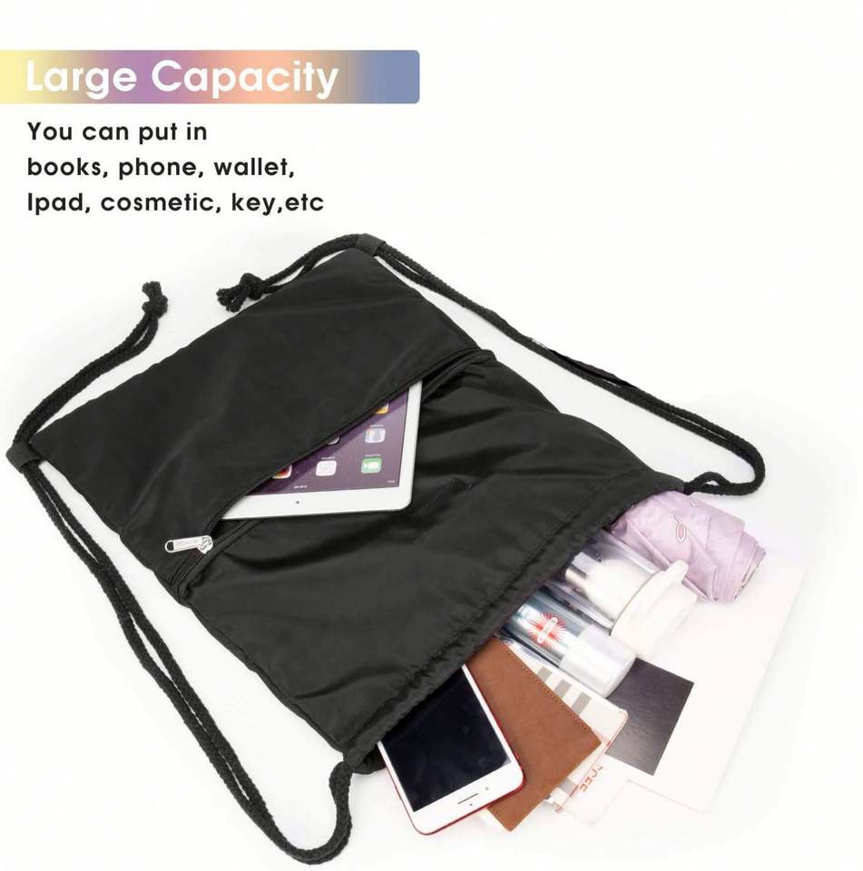 กระเป๋าเป้สะพายหลังกีฬาไนลอนขายส่งแบบมีซิป ผลิตจากโพลีเอสเตอร์รีไซเคิลสีดำ 210d พร้อมเชือกผูก สำหรับผู้ชายและผู้หญิง