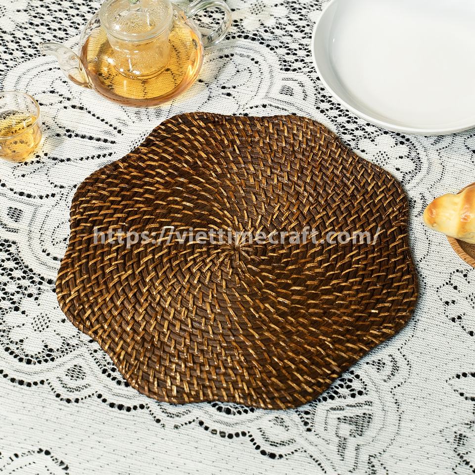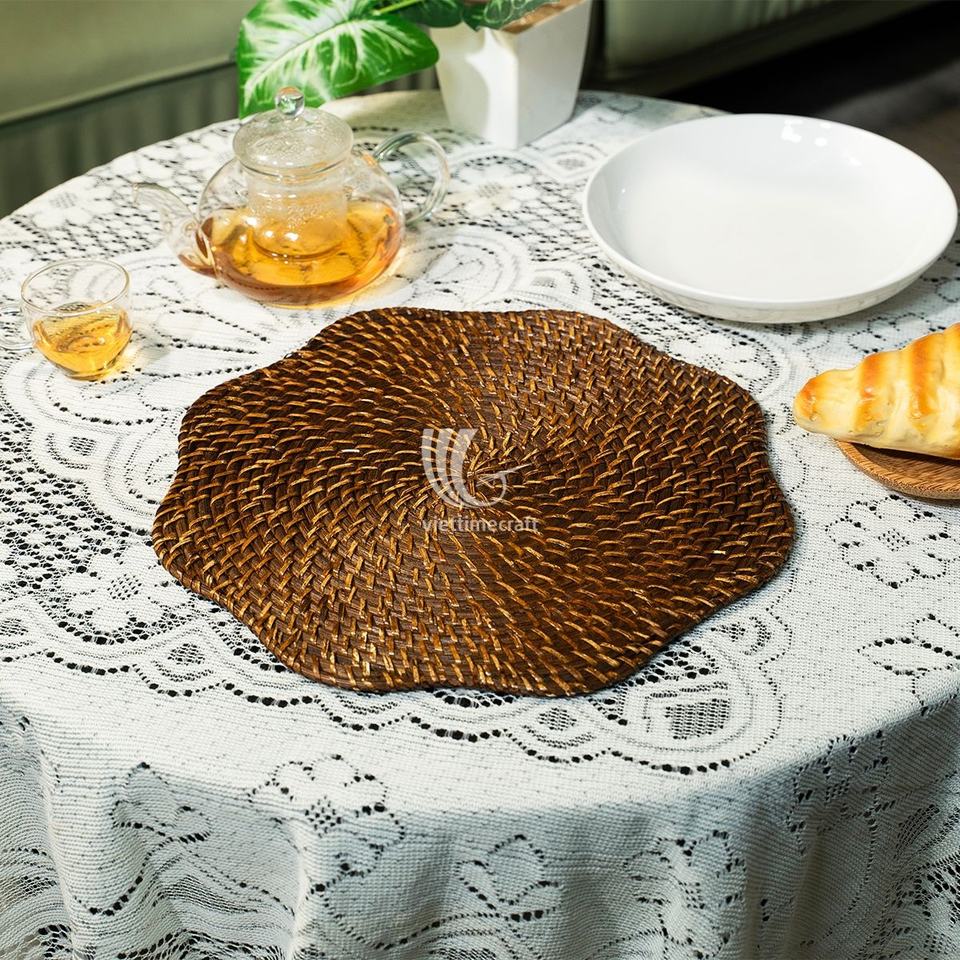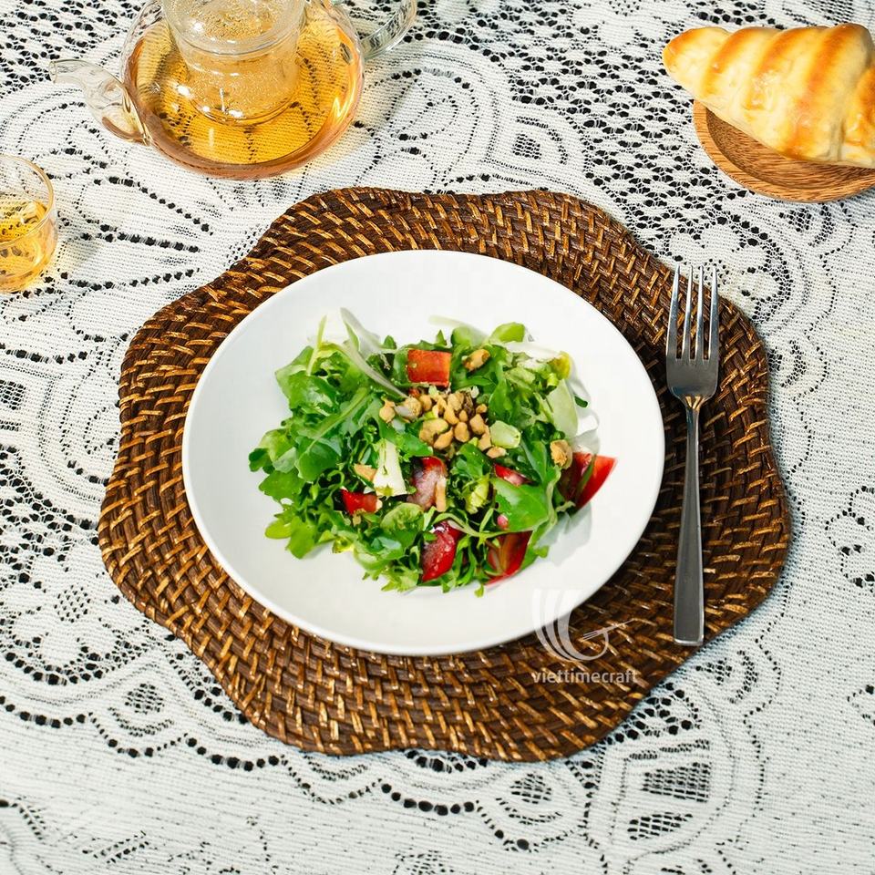 แผ่นรองจานหวายลายดอกไม้สไตล์โบฮีเมียน รักษ์โลก หนา 5 มม. ของตกแต่งโต๊ะ ผลิตในเวียดนาม ผ้าปูโต๊ะสำหรับรับประทานอาหาร ขายส่ง