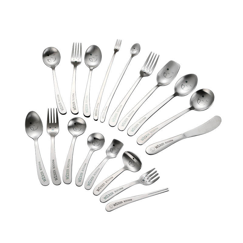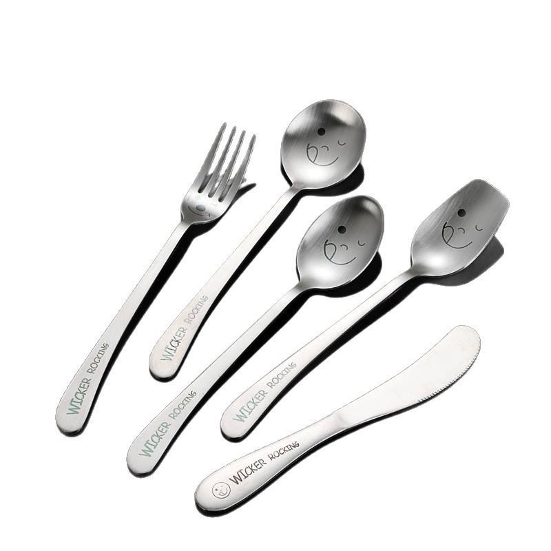 ชุดช้อนส้อมเด็กแบบโยกได้ วัสดุสแตนเลส 304 ลายหน้ายิ้ม เกรดสำหรับอาหาร สำหรับเด็ก