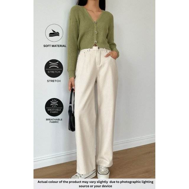 กางเกงยีนส์เดนิมทรงขากว้างสีครีม ผ้าฝ้ายเนื้อนุ่ม ยืดหยุ่นได้ เป็นมิตรกับสิ่งแวดล้อม ทนทาน ตกแต่งด้วยการเคลือบ 5 กระเป๋า สไตล์โมเดิร์นสตรีทแฟชั่น ไซส์ 26