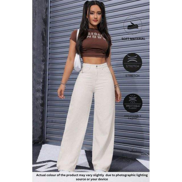 Fit Type: Wide Leg / Loose Fit, Waist Type: High Waist, Fabric: Stretch Denim (Cotton + Stretch Denim), Length: Full Length (Approx. 40 inches), Closure Type: Zipper Fly with Metal Button, Pattern Type: Solid / Plain, Pocket Type: 5-Pocket Classic Design, Stitching: Double-Needle Durable Stitch, Details: Clean Look / Minimalist Finish / Premium Thread Work, Wash Type: Enzyme Wash / Soft Finish, Usage: Casual Wear/ Street Style/ Daily Comfort
