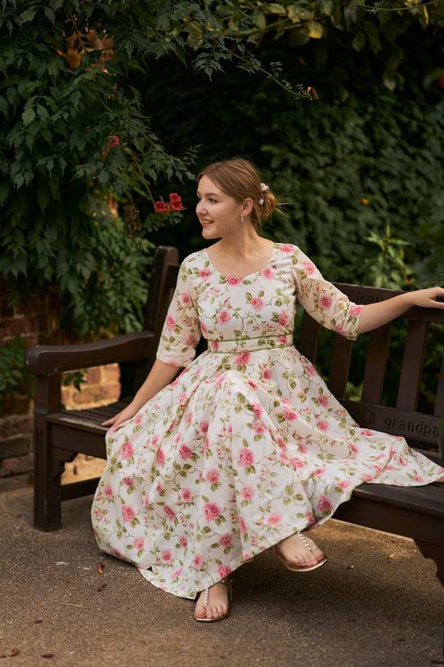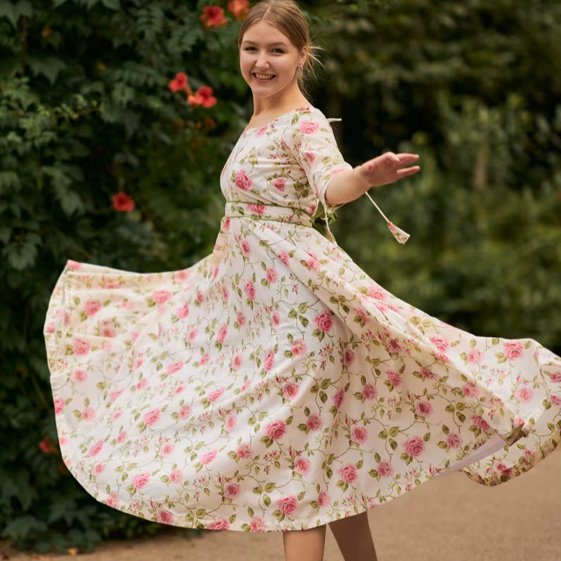 ชุดกุหลาบป่าชุดเดรสผ้าฝ้ายแท้แบบโบฮีเมียนพิมพ์ลายดอกไม้สีขาวและดอกกุหลาบแฟชั่นทำด้วยมือที่มีจริยธรรม