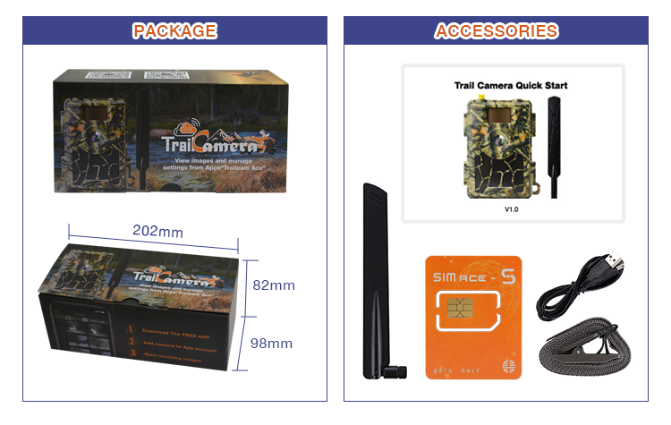 * Packing List Trail Camera, Mounting Strap, USB Cable, Antenna, Quick start manual, User's manual * Packing Specification Box:202*98*82 mm; 485 g Carton: 50.5*41.8*18.8 cm; 11.2 kg (16 boxses/ctn.)