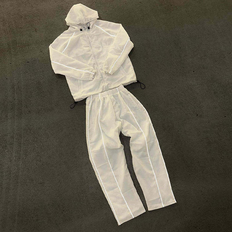 เสื้อแจ็คเก็ตไนลอนแบบมีฮู้ด สกรีนโลโก้ได้ ชุดกีฬาผู้ชาย ชุดวอร์มไนลอนแบบสองชิ้น ชุดเซ็ตวอร์มผู้ชาย