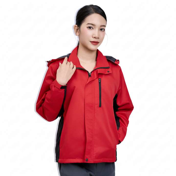 เสื้อแจ็คเก็ตแบบแข็ง ผ้าโพลีเอสเตอร์ 100% สีแดง-ดำ กันลม กันน้ำ ซิปบาง ระบายความร้อนได้ดี ใส่ได้ทั้งชายและหญิง