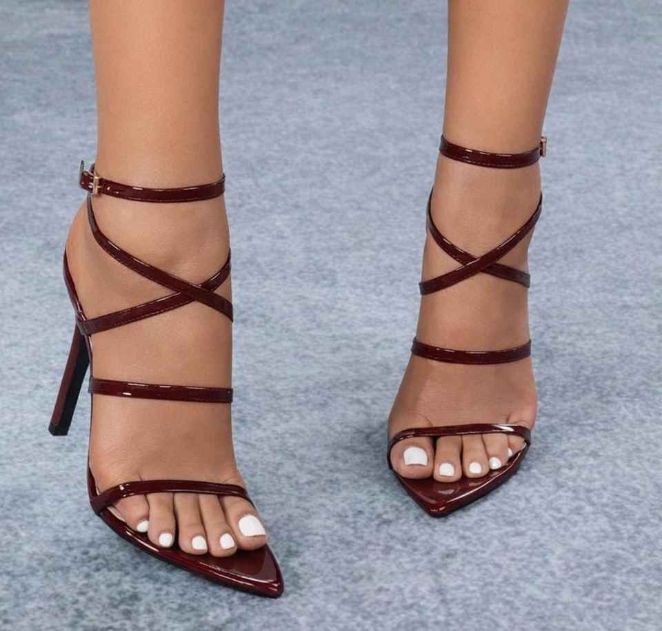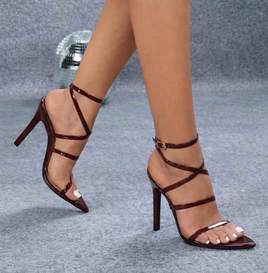 รองเท้าส้นสูงสีแดงไวน์แบบเปิดนิ้วเท้า ส้นสูง 4 นิ้ว รองเท้าส้นสูงแบบเรียบ ทำจากวัสดุสังเคราะห์