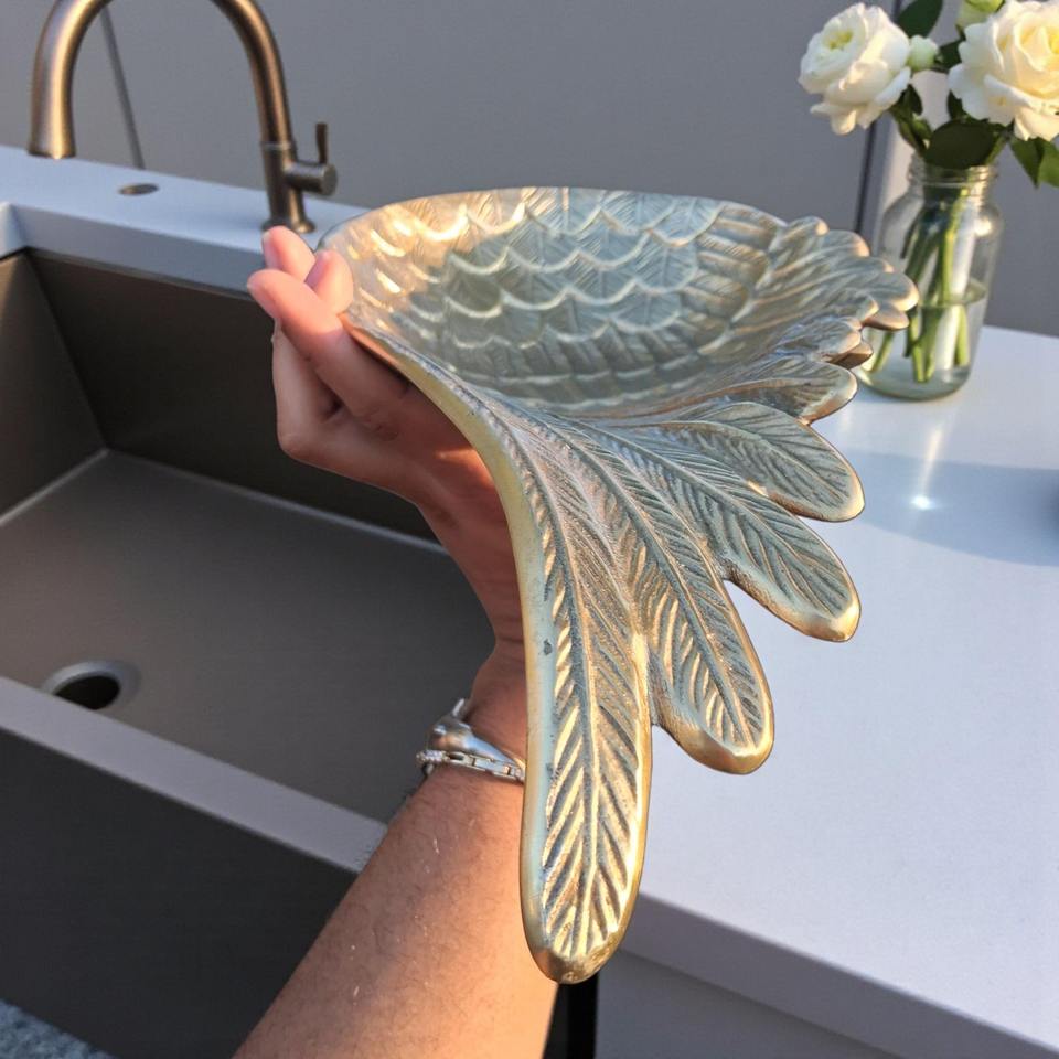 ชามตกแต่งทรงปีกทำจากทองเหลืองสีเงิน เหมาะสำหรับใช้ในชีวิตประจำวันและสำหรับจัดแสดงบนโต๊ะรับแขก ผลิตด้วยมือจากอินเดีย