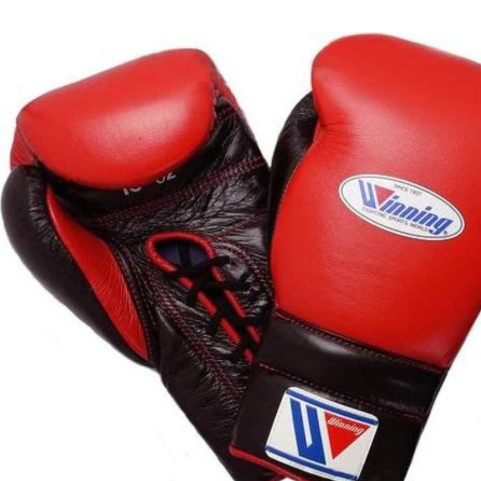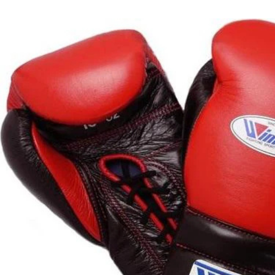 ถุงมือชกมวยแบบผูกเชือก Winning สีแดงดำ หนังแท้คุณภาพพรีเมียม สำหรับการฝึกซ้อมและการแข่งขันระดับมืออาชีพ ขนาด 8 ออนซ์ 10 ออนซ์ 12 ออนซ์