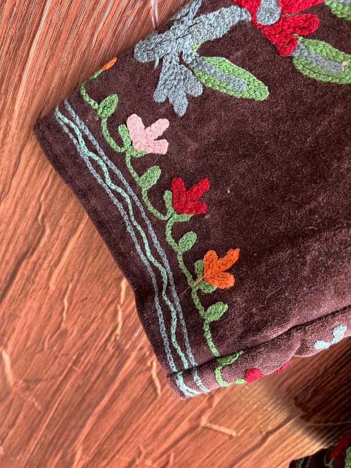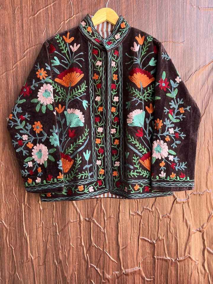 เสื้อแจ็คเก็ตวาร์ซิตี้ผ้ากำมะหยี่ปักลายดอกไม้สไตล์โบฮีเมียนสำหรับฤดูใบไม้ร่วงและฤดูหนาว เป็นมิตรกับสิ่งแวดล้อม กันลม ระบายอากาศได้ดี บุด้วยผ้าฝ้ายซูซานีถัก