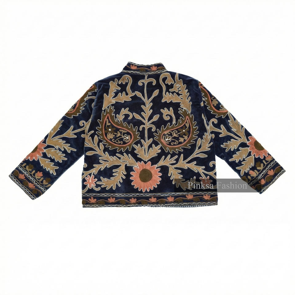 เสื้อแจ็คเก็ตวาร์ซิตี้ผ้ากำมะหยี่ถักลายปักดอกไม้สไตล์โบฮีเมียนสำหรับฤดูใบไม้ร่วงและฤดูหนาว เป็นมิตรกับสิ่งแวดล้อม ป้องกันรอยยับ กันลม ระบายอากาศได้ดี ลายซูซานี