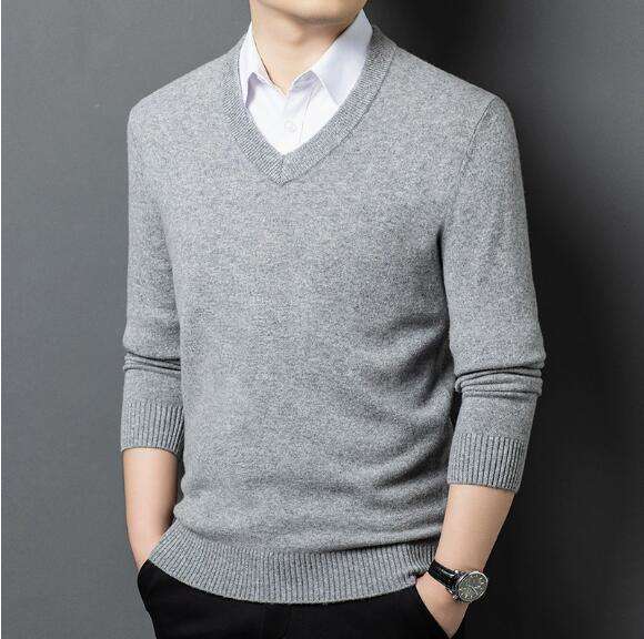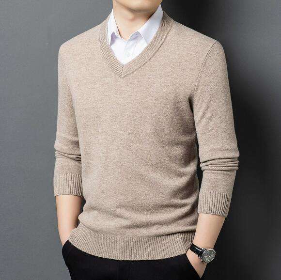 เสื้อสเวตเตอร์ผู้ชายคอวี แขนยาว ผ้าฝ้าย 100% สำหรับฤดูหนาว พร้อมโลโก้ด้านหน้า