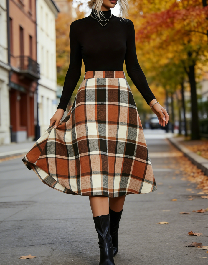 กระโปรงทรงสวิงเอวธรรมชาติความยาวระดับเข่าลายตาข่ายแบบตารางสำหรับผู้หญิงไซส์ใหญ่สไตล์ลำลองสำหรับฤดูหนาว