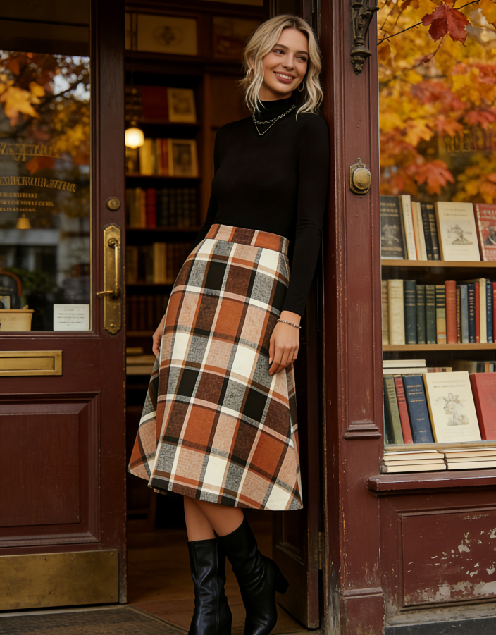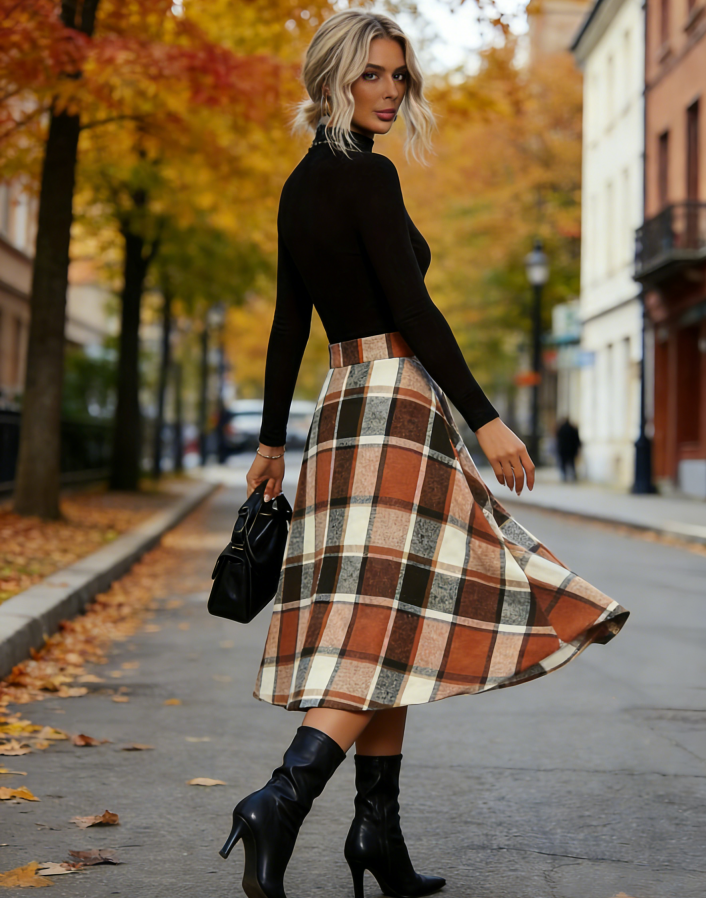 กระโปรงทรงสวิงเอวธรรมชาติความยาวระดับเข่าลายตาข่ายแบบตารางสำหรับผู้หญิงไซส์ใหญ่สไตล์ลำลองสำหรับฤดูหนาว
