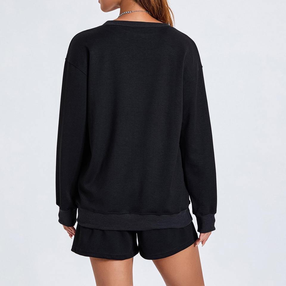 เสื้อสเวตเชิ้ตโอเวอร์ไซส์สีดำแบบลำลองสำหรับฤดูหนาวที่เป็นมิตรต่อสิ่งแวดล้อม และกางเกงขาสั้นแบบมีเชือกผูกเอว ชุดสองชิ้นสำหรับผู้หญิง