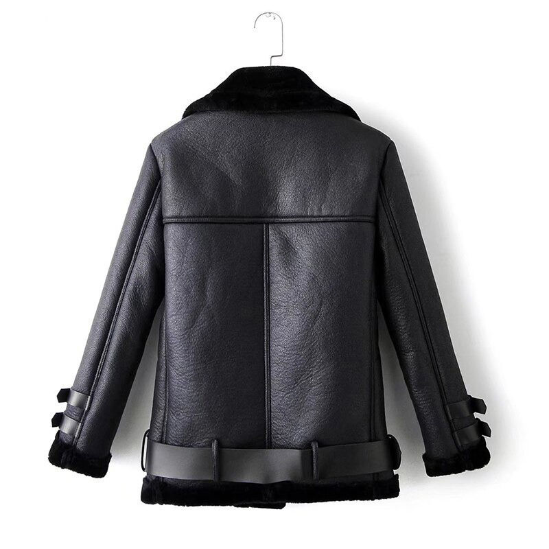 แจ็กเก็ตหนังเทียมนิ่มมีซิปสำหรับผู้หญิงเสื้อโค้ทธรรมดาคอเสื้อแจ็กเก็ตมอเตอร์ไซค์มีเข็มขัด