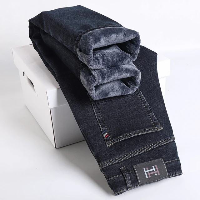 Winter Fleece Thick Warm Men's Slim Straight Elastic Denim Jeans Casual Fashion Plush Style 1