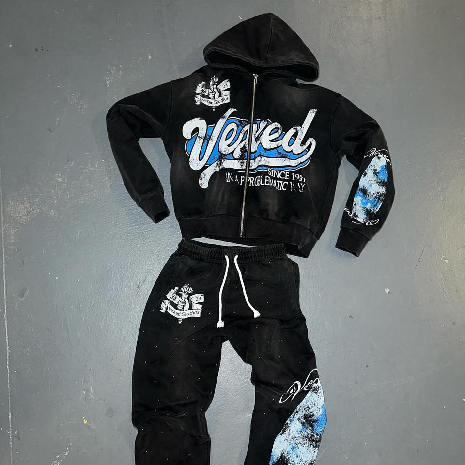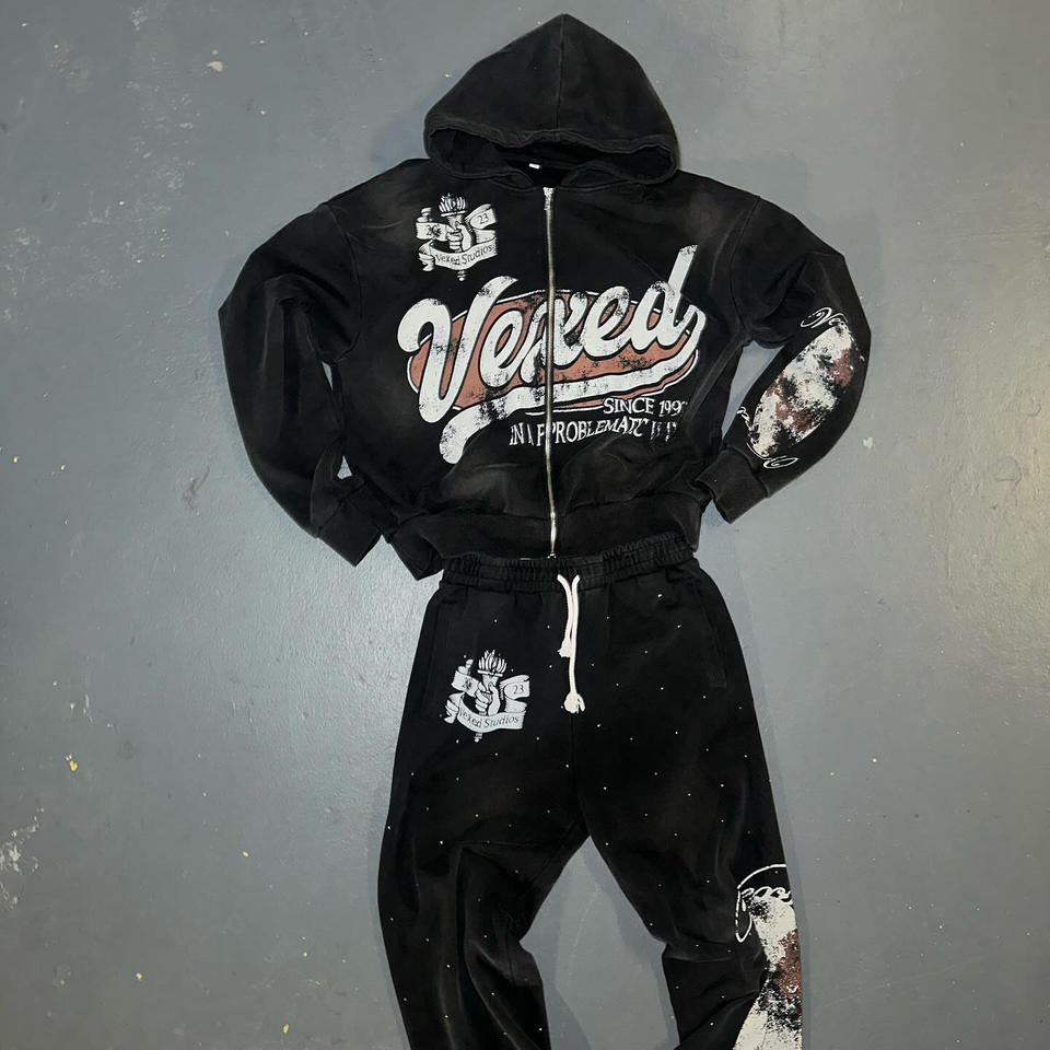 กางเกงวอร์มแทรคสูทผ้าหนานุ่มสำหรับฤดูหนาว ล้างสีแบบแอซิดวอช ซิปปิด ปักลายด้วยเทคนิค DTG ประดับคริสตัล ล้างสีแบบวินเทจ สำหรับผู้ชาย