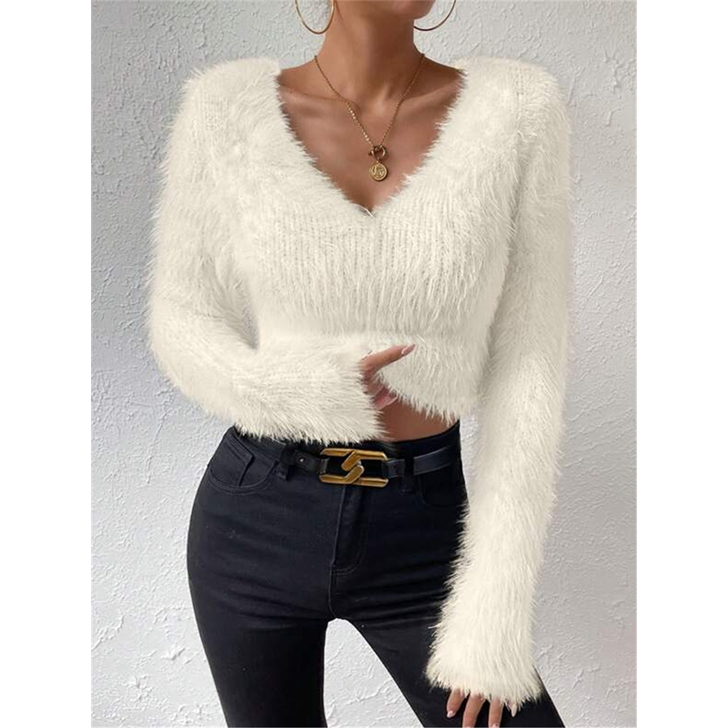 เสื้อไหมพรมคอวีทรงเข้ารูปสไตล์ยุโรปและอเมริกาแบบใหม่สำหรับฤดูหนาว เสื้อครอปสไตล์เกาหลีสำหรับผู้หญิง
