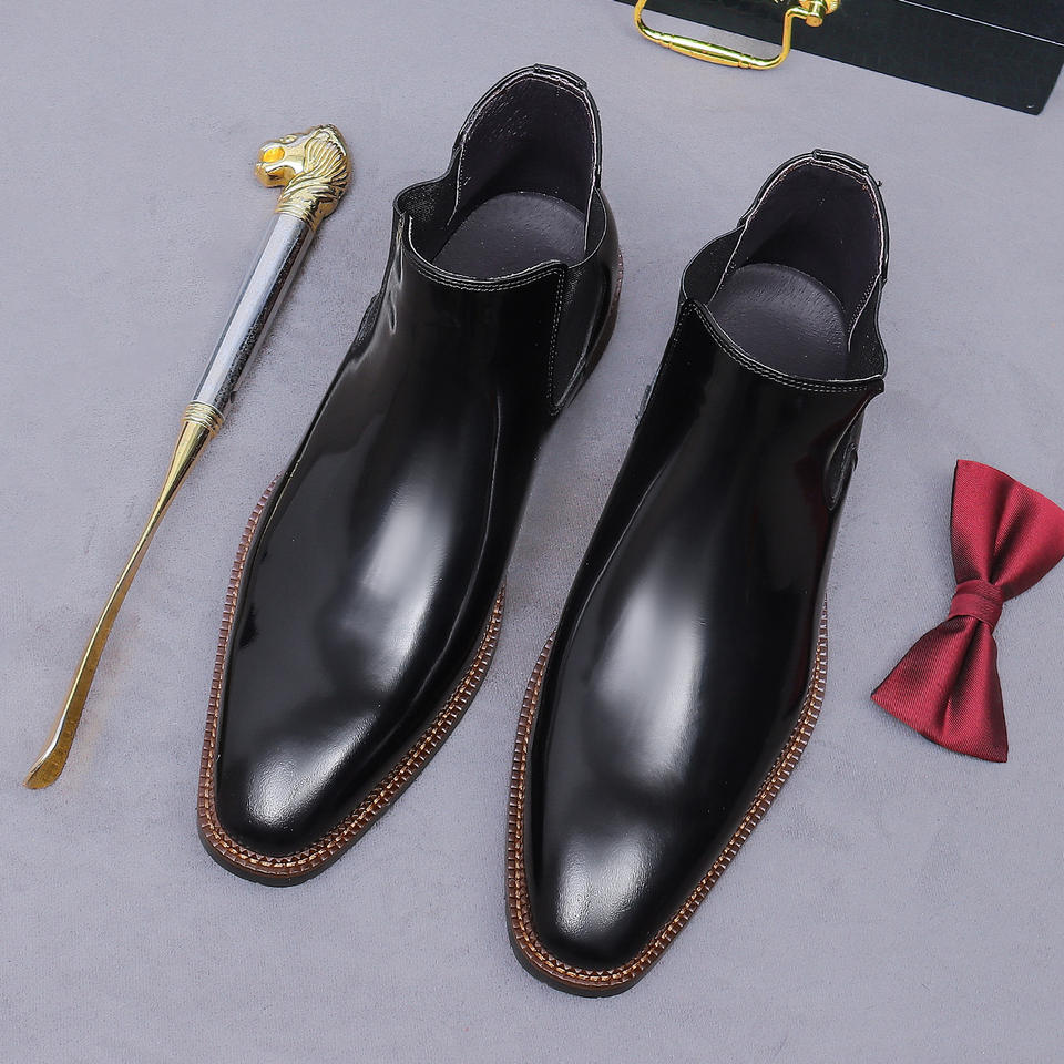 รองเท้าบูทหนังหัวแหลมสีดำสไตล์ใหม่สำหรับฤดูหนาว รองเท้าบูทสั้นแบบมีซิปเพิ่มความสูงสำหรับผู้ชาย ทำจากหนังวัว รองเท้าบูทหุ้มข้อสูงสำหรับผู้ชาย