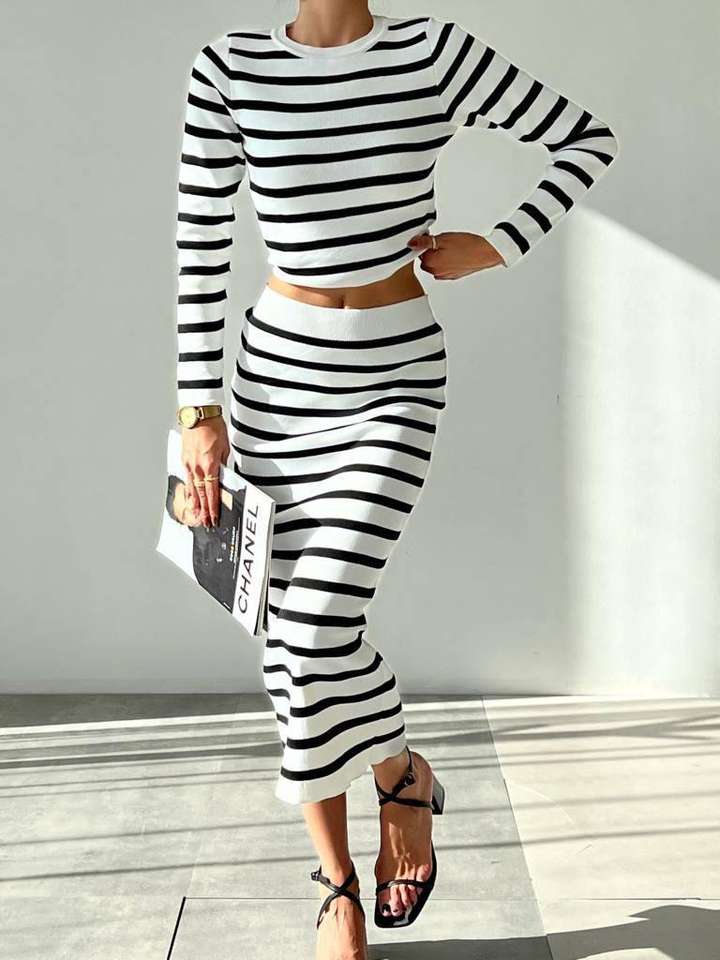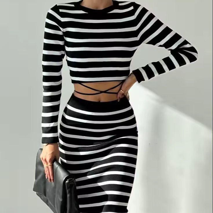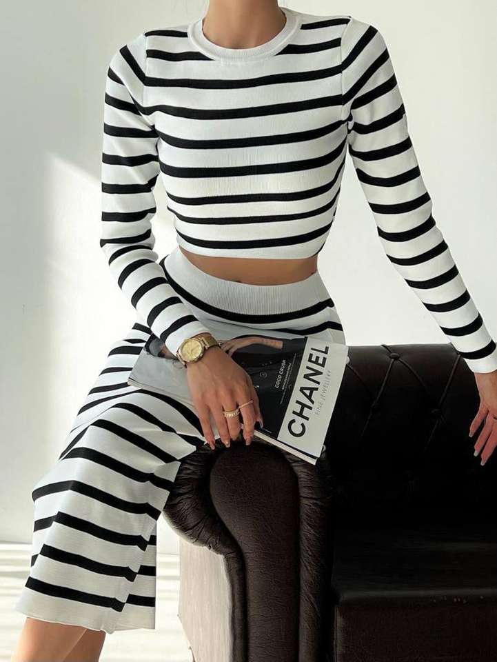 ชุดกระโปรงถักสองชิ้นสำหรับผู้หญิงสีดำ, ชุดกระโปรงกางเกงแขนยาวลายทางสีตัดกันใหม่สำหรับฤดูหนาว
