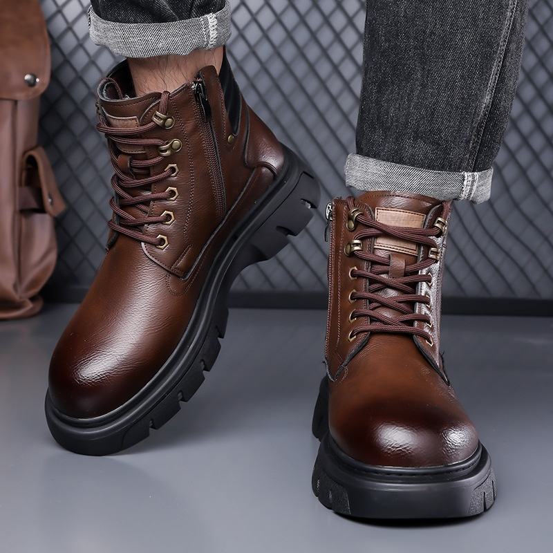 รองเท้าบูทหุ้มข้อสูงบุขนหนานุ่มสำหรับผู้ชาย สไตล์ลำลอง กันลื่น เหมาะกับหิมะ สไตล์อังกฤษ เพิ่มความสูง