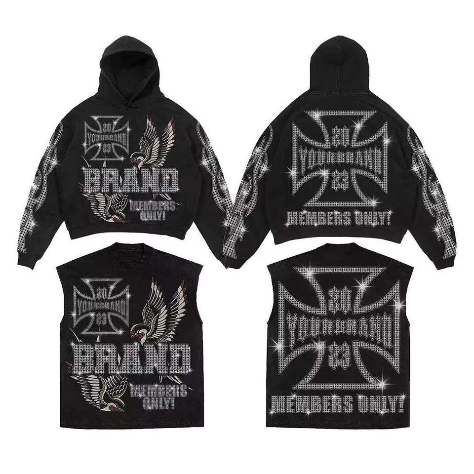 กางเกงวอร์มทรงบานมีฮู้ดสำหรับผู้ชาย ใส่สบาย ระบายอากาศได้ดี เหมาะสำหรับฤดูหนาว ตกแต่งด้วยกลิตเตอร์และเพชรเต็มตัว ผลิตจากผ้าฝ้าย 100% น้ำหนัก 500 กรัม ด้านหน้า