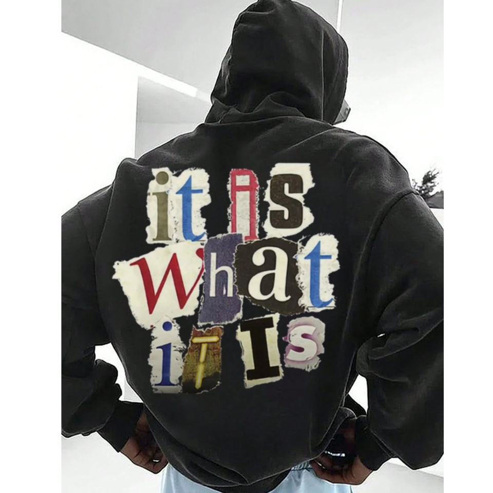 เสื้อฮู้ดโอเวอร์ไซซ์ฤดูหนาวมีกระเป๋าจิงโจ้พิมพ์ลายซิปด้านหน้าและกระดุมข้อมือเสื้อปิดไหล่สีดำ