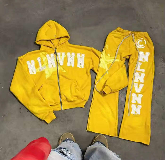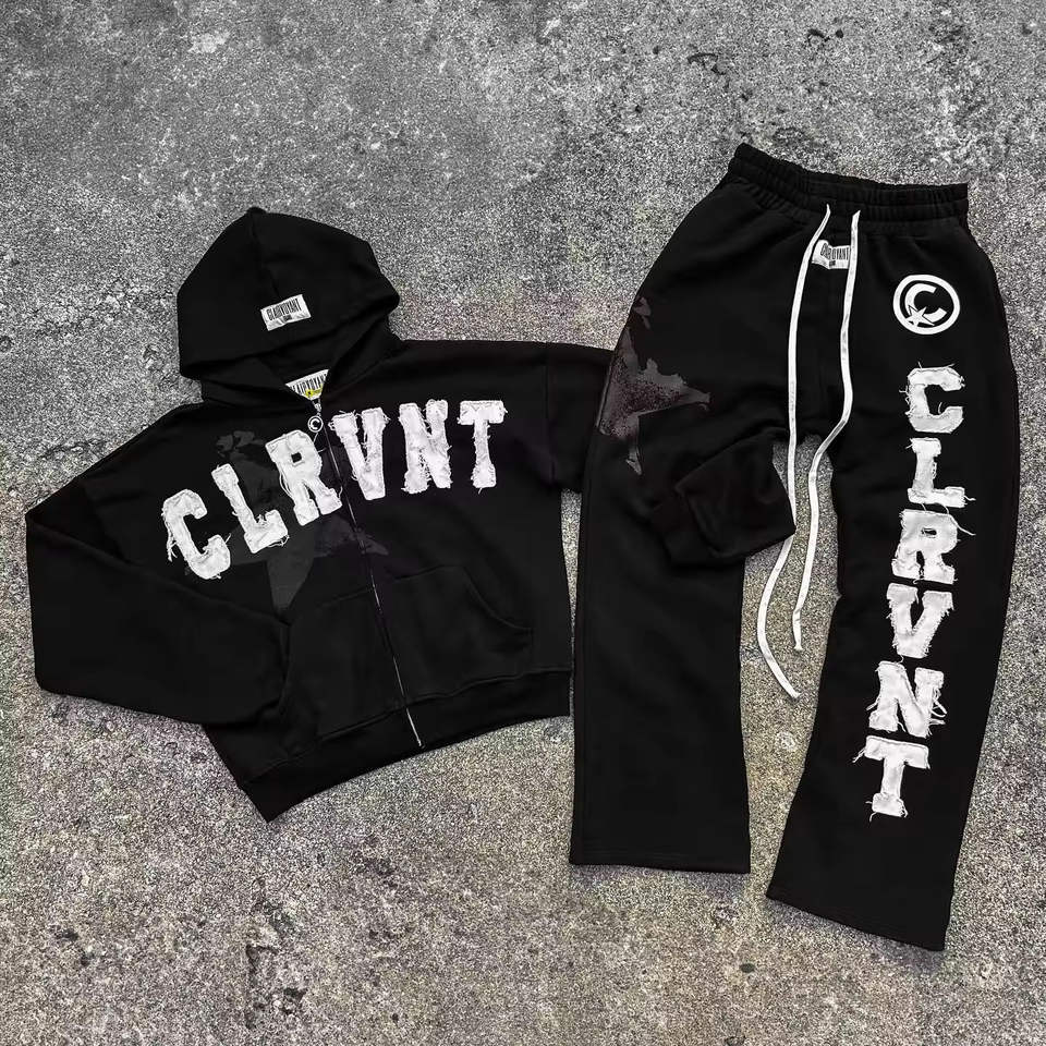 ชุดเซ็ตเสื้อฮู้ดดี้และกางเกงวอร์มผู้ชายผ้าเฟรนช์เทอร์รี่ทรงหลวม ลวดลายปักแบบดิสเทรส สไตล์วินเทจ ล้างสีแบบแอซิดวอช