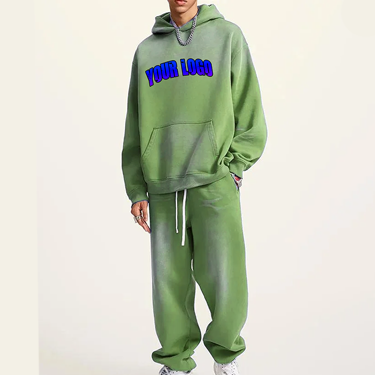 ชุดวอร์มสตรีทแวร์ฤดูหนาวแบบสั่งทำพิเศษ ล้างสีแบบแอซิดวอช สไตล์วินเทจ ผ้าฟลีซ ชุดเซ็ตฮู้ดดี้และกางเกงขายาวแบบดิสเทรส แต่งผ้าปะติดปะต่อสำหรับผู้ชาย