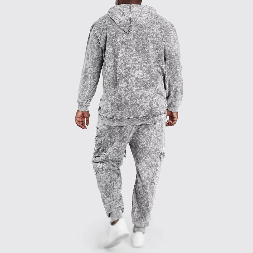 ชุดเซ็ตฮู้ดดี้และกางเกงวอร์มผู้ชายสไตล์วินเทอร์สตรีทแวร์ พิมพ์ลายตามสั่ง แต่งดีเทลขาดๆ ปักลาย ประดับเพชร ซิปหน้า ล้างสีแบบแอซิดวอช