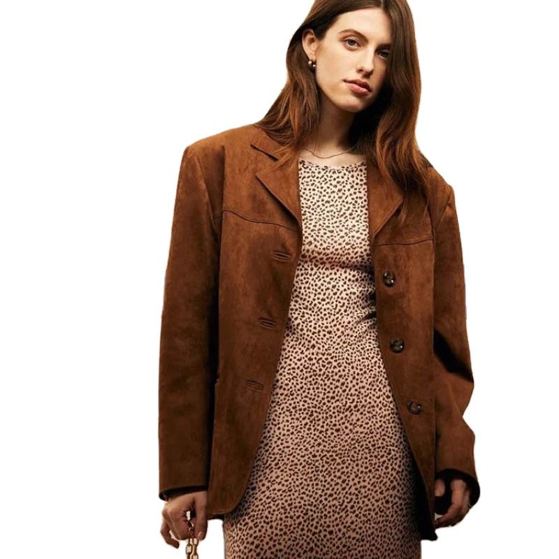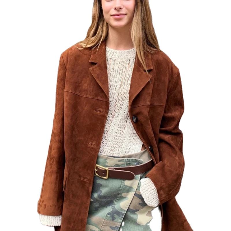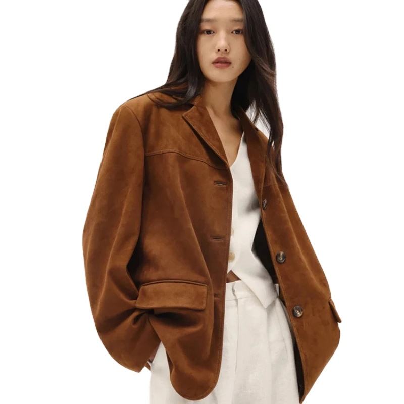 เสื้อแจ็คเก็ตเบลเซอร์ผ้าหนังกลับหนังแท้ถักทอระบายอากาศผ้าแคนวาสแบบต่อผ้าปกเสื้อแบบลาペルสไตล์เรโทรสีพื้น