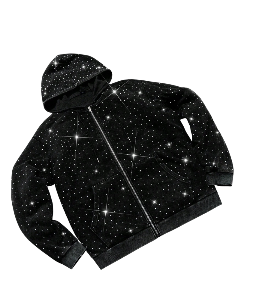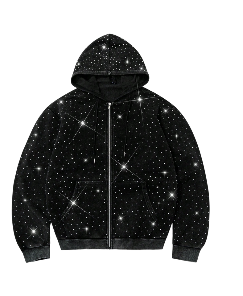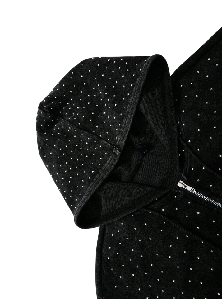 เสื้อฮู้ดดี้ขนแกะปักลายคริสตัลแบบซิปสำหรับฤดูหนาว ดีไซน์วิบวับ แบบยูนิเซ็กซ์ รับผลิตตามแบบ ODM ผ้าฟลีซระบายอากาศได้ดี ล้างสีแบบแอซิดวอช