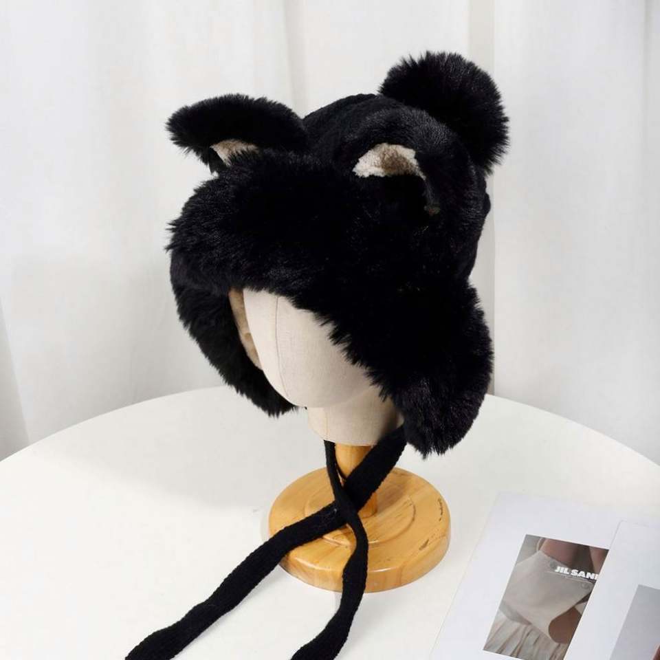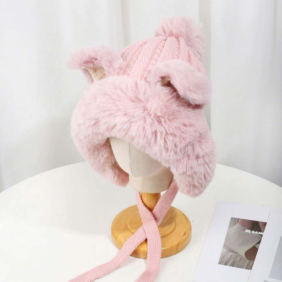 หมวกบีนนี่อุ่นๆ สำหรับฤดูหนาว พร้อมหูฟ็อกซ์ - หมวกไหมพรมลายการ์ตูนสัตว์น่ารัก หมวกปอมปอม หมวกไหมพรมสำหรับผู้หญิง