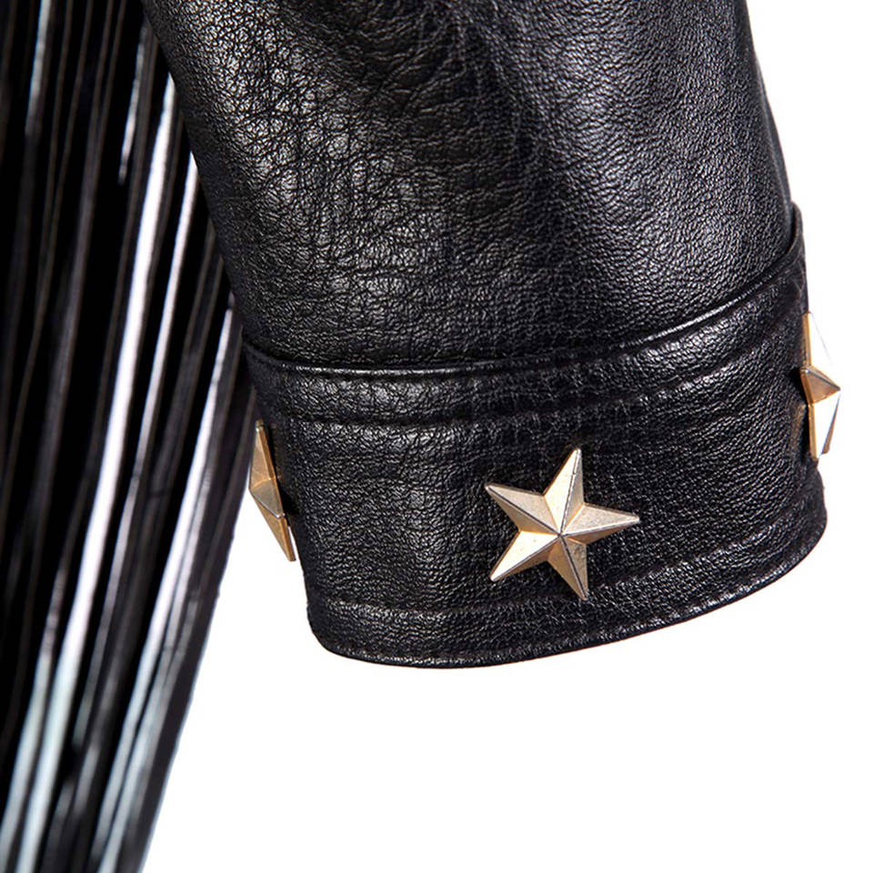 เสื้อแจ็กเก็ตหนังสีดำของผู้หญิงสำหรับใส่ในฤดูหนาวอบอุ่นมีสไตล์กระดุมรูปดาวมีขอบยาว