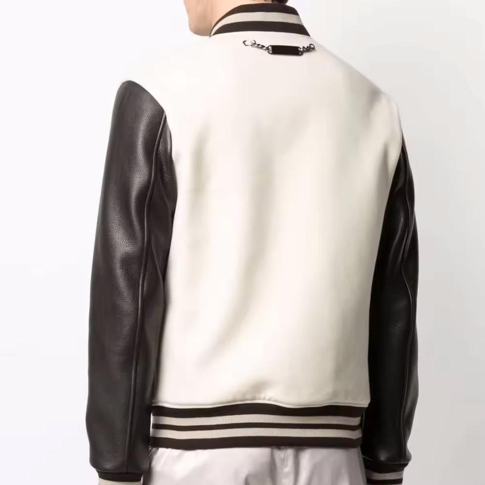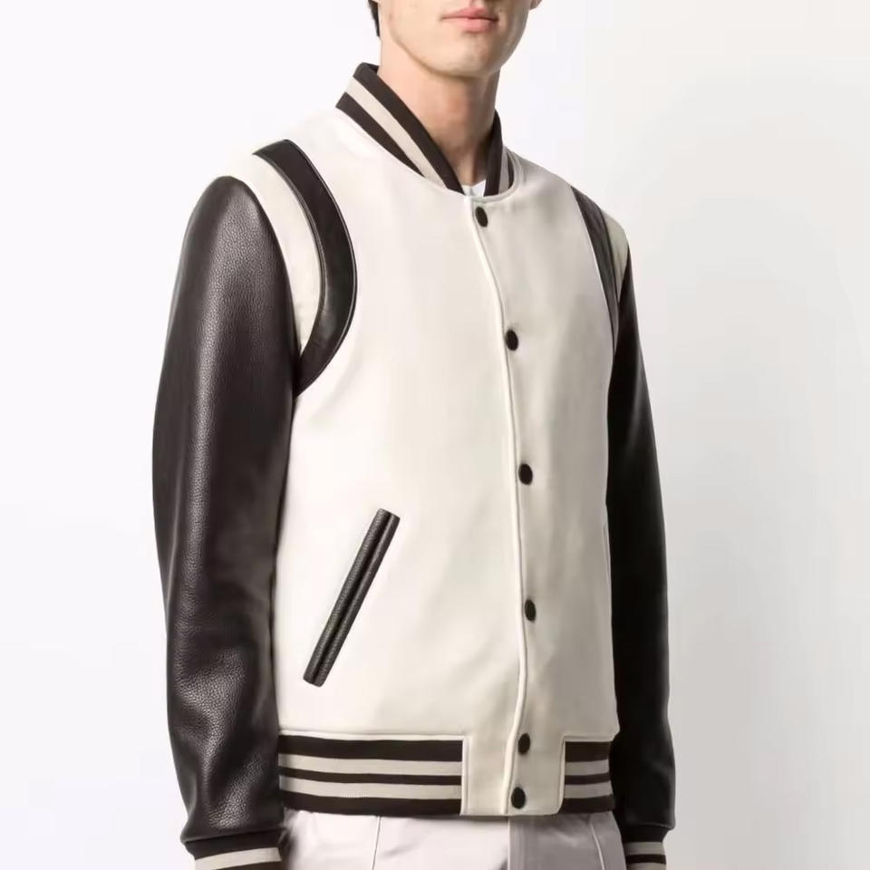 เสื้อแจ็คเก็ตฤดูหนาวแบบกำหนดเองสำหรับผู้ชาย แจ็คเก็ตเลตเตอร์แมนพร้อมโลโก้ที่ปรับแต่งได้ เสื้อแจ็คเก็ตเลตเตอร์แมนแขนหนัง เสื้อโค้ทฤดูหนาวสำหรับผู้ชาย
