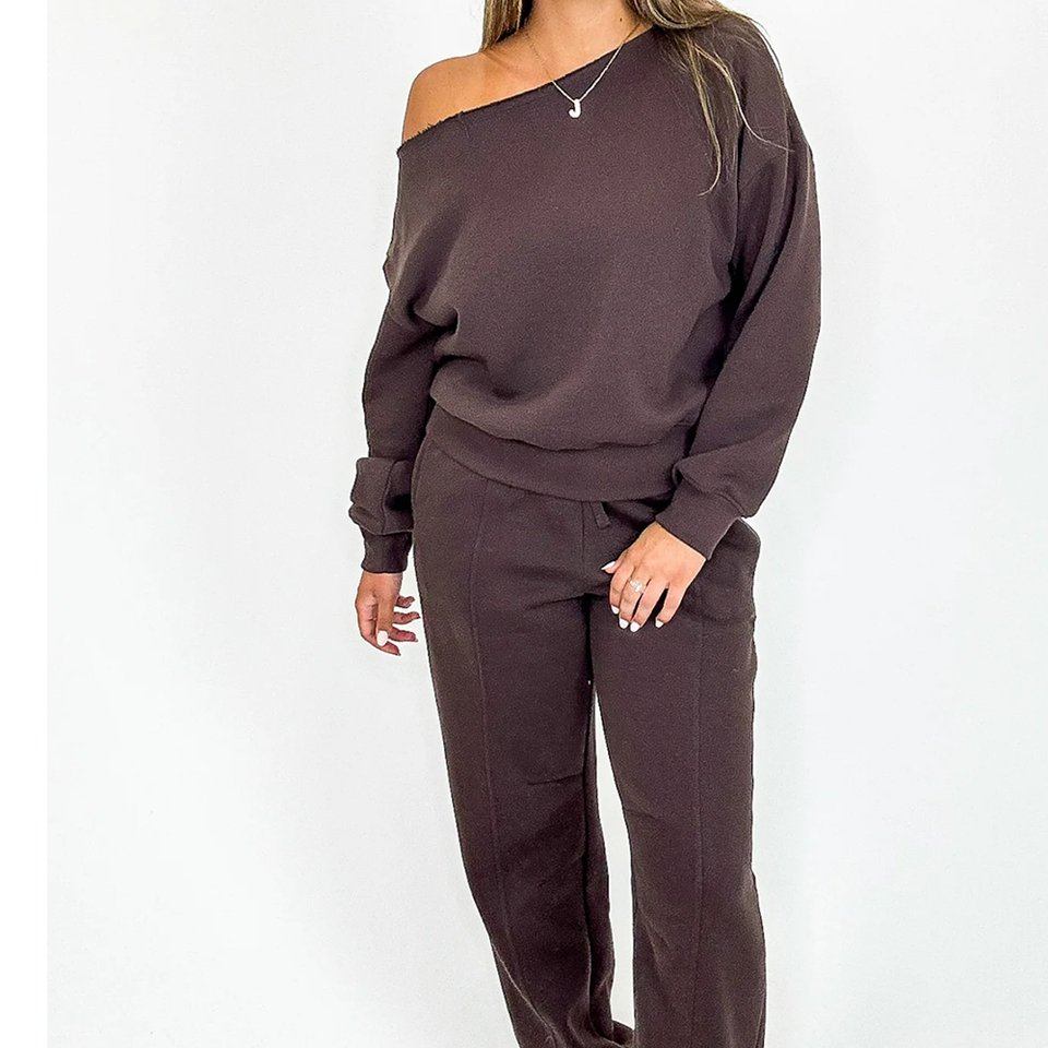 เสื้อสเวตเชิ้ตแขนยาวแบบเปิดไหล่สไตล์ลำลองสำหรับผู้หญิง ผ้าเฟรนช์เทอร์รี่ พิมพ์ลายโลโก้ด้านหน้า กางเกงจ็อกเกอร์เอวสูง สไตล์ลำลองแนวสตรีทแวร์