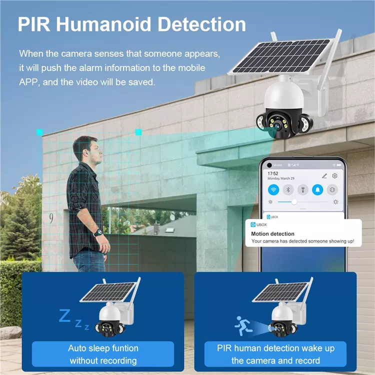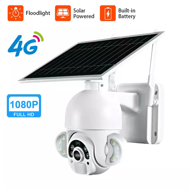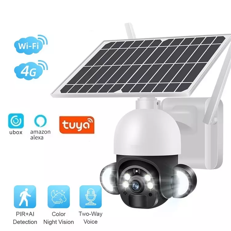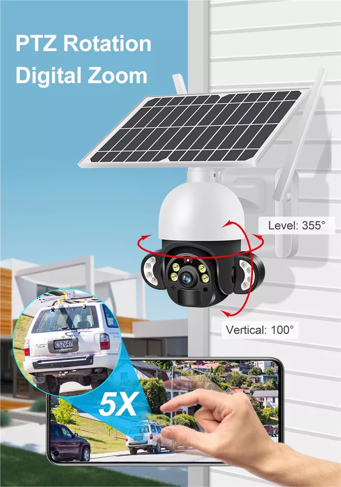 กล้องรักษาความปลอดภัยพลังงานแสงอาทิตย์กลางแจ้งแบบไร้สายพร้อมแบตเตอรี่12000MAh PIR AI ตรวจจับมนุษย์ระบบเฝ้าระวัง PTZ