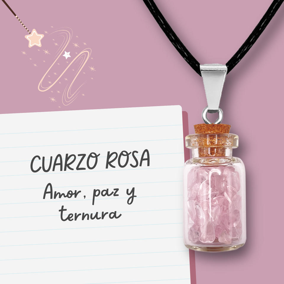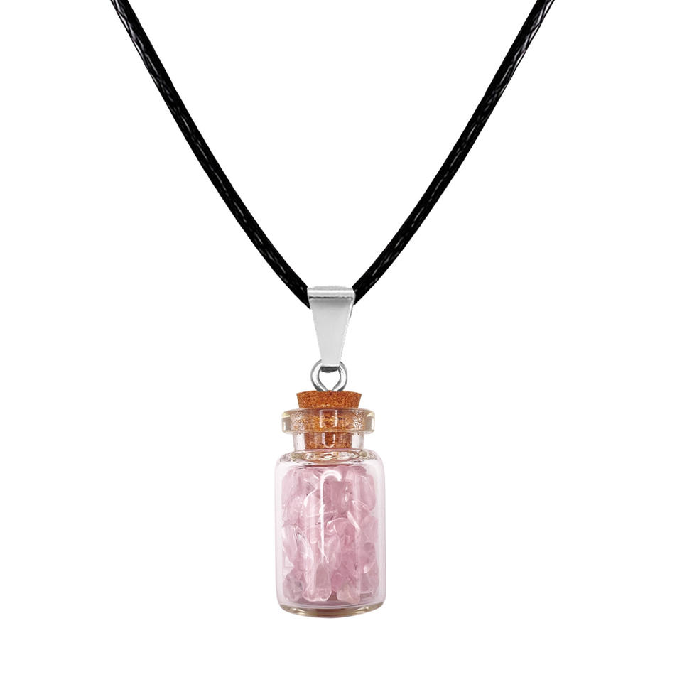 จี้ขวดแก้วพร้อมโรสควอตซ์ จี้นำโชค จี้และเครื่องรางสีชมพู สร้อยคอจี้สีชมพู