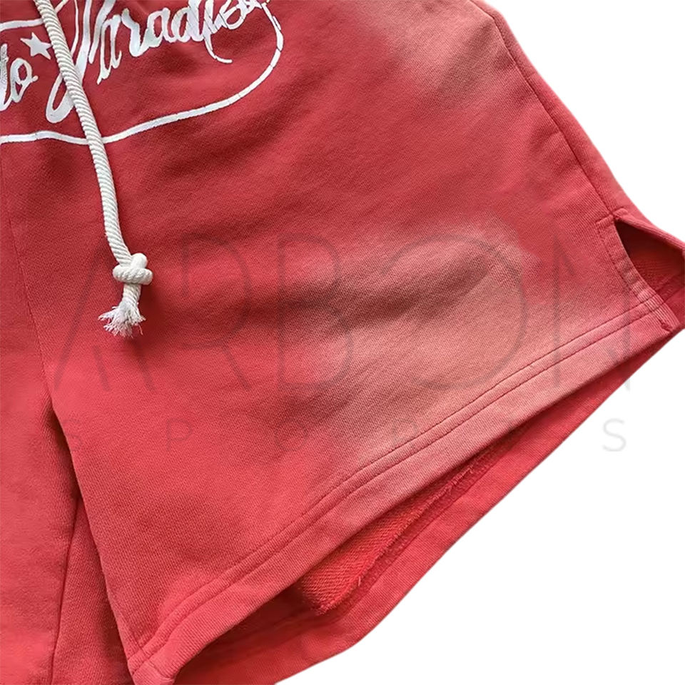 กางเกงขาสั้นผ้าสัมผัสนุ่มสำหรับผู้ชายดีไซน์แนวสตรีทด้านนอกพิมพ์ลายสีแดงผ้าสัมผัสนุ่ม